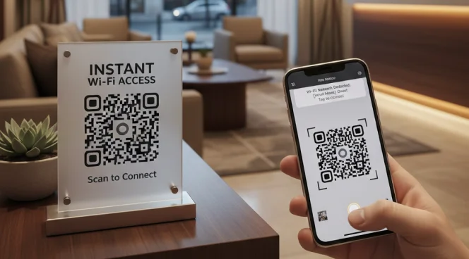 Coloque códigos QR Wi-Fi nos quartos, lobbies, restaurantes e espaços para reuniões para acesso instantâneo à rede. Os hóspedes podem se conectar automaticamente sem digitar senhas, reduzindo as perguntas na recepção sobre o Wi-Fi.